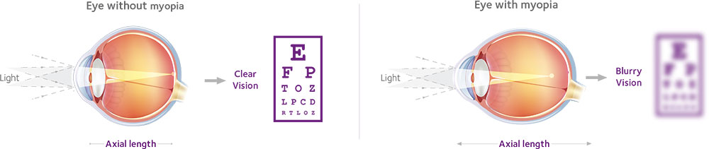 The eye with myopia is longer from front to back than the eye without myopia. Generally, as the eye grows longer, visual impairment becomes more drastic.