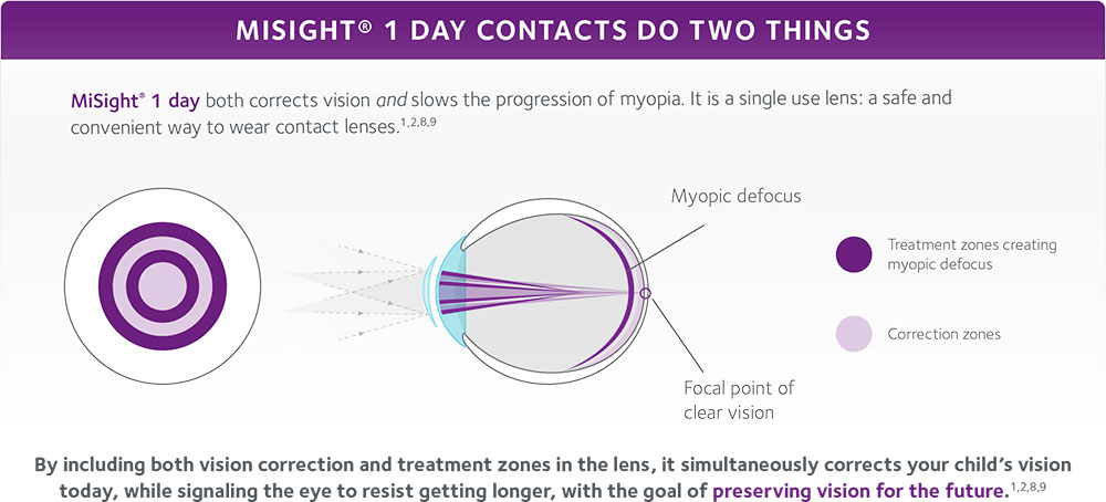 Have you noticed your child’s nearsightedness (myopia) getting worse, especially with increased screen time and indoor lifestyle? MiSight® 1 day is the only dual purpose contact lens to correct vision and reduce the rate of myopia progression in children aged 8-12 at the initiation of treatment.1,2*†‡§|| Ask your eye doctor how MiSight® 1 day contact lenses can help your age-appropriate child. Don’t let myopia interfere with your child’s bright future.